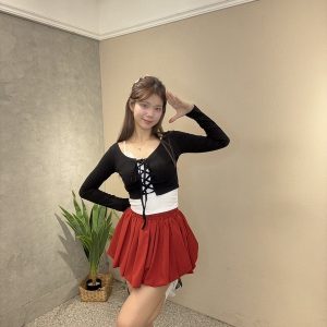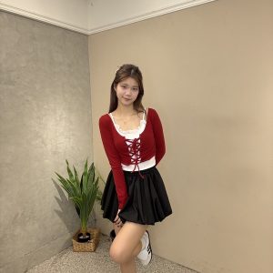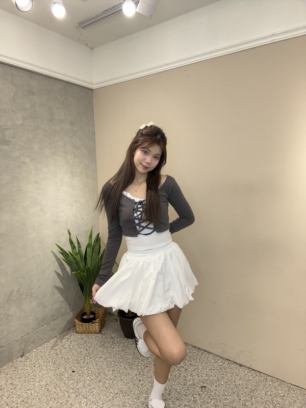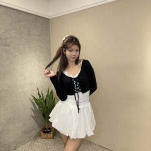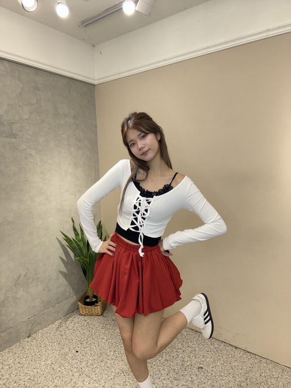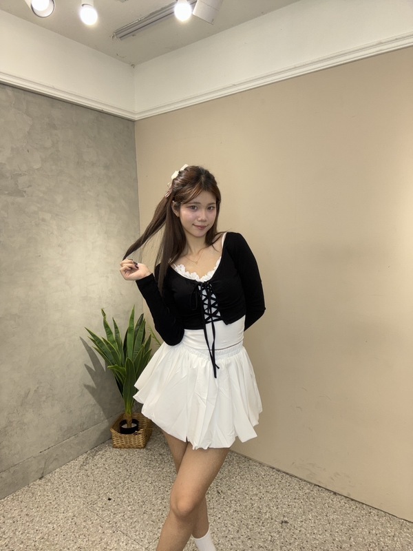 上衣採用前綁帶設計,修飾身形曲線,搭配內裡蕾絲細節,更添精緻感。